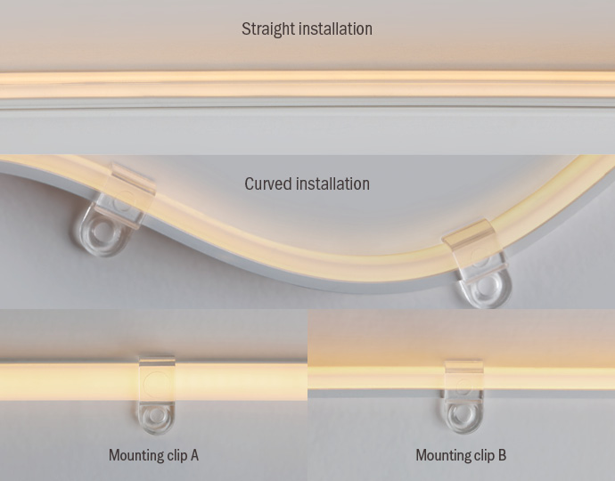 Specially designed rail cover to prevent rippling and sagging of the product, along with two types of mounting clips for curved installation.