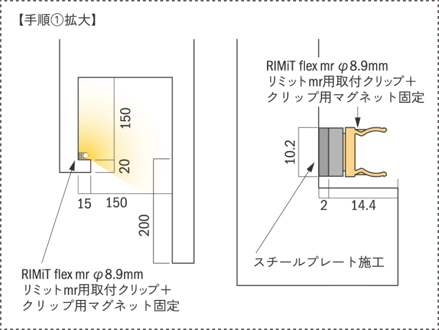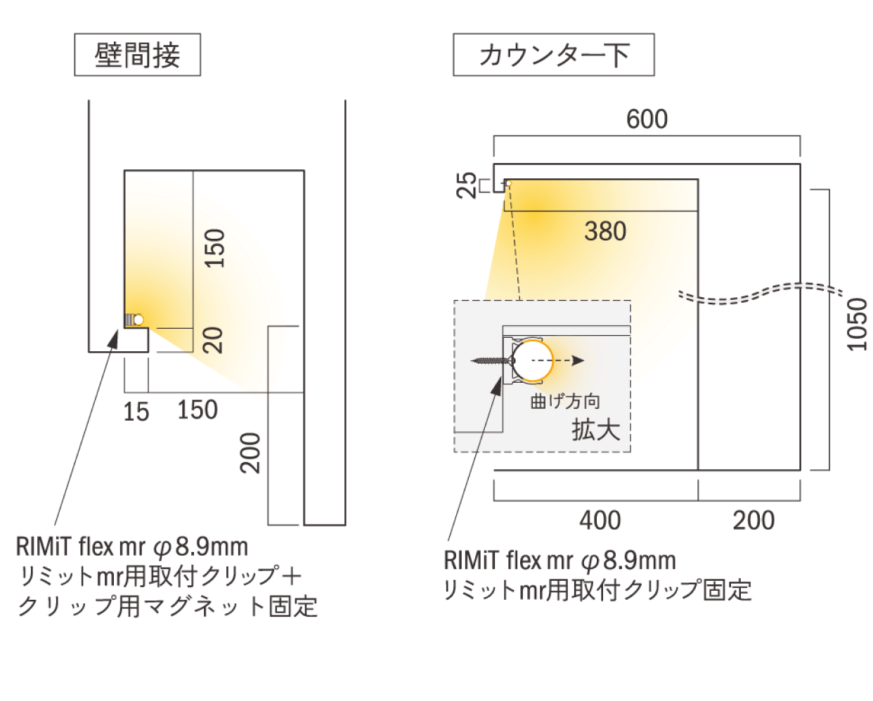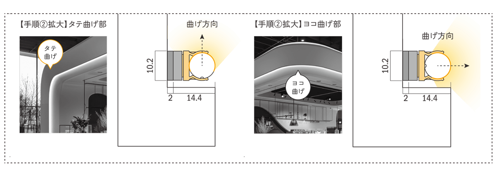 曲線部もマグネットで簡単取付。狭小スペースでもスムーズに施工できます。器具の向きを変えるだけで、ヨコ曲げ・タテ曲げ両方に対応。