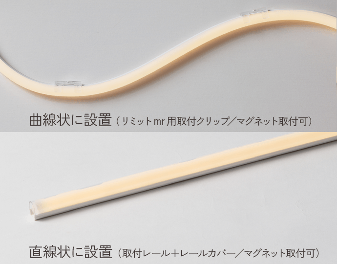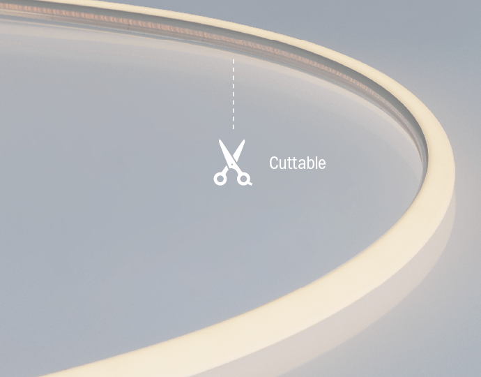 均一で美しい超広配光。現場でカット可能(屋内仕様のみ)。屋内仕様/防滴仕様で特注可能で、自由度の高い曲線デザインを実現します。