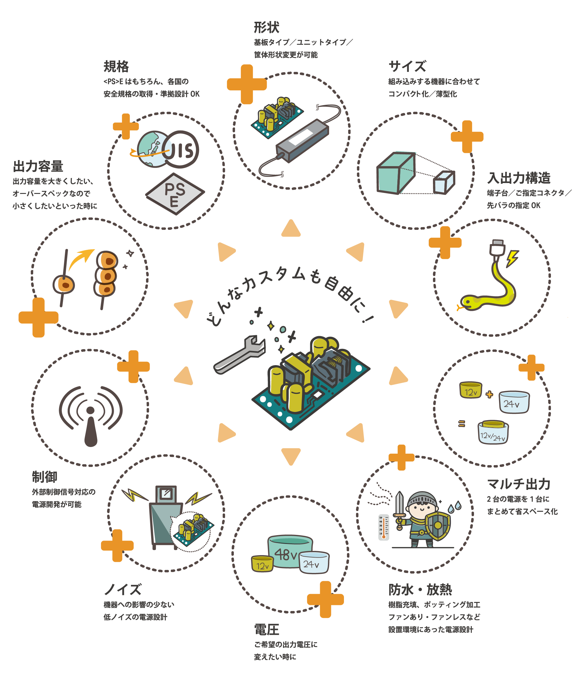 標準電源にはない、ご要求仕様の電源をカスタム開発します。